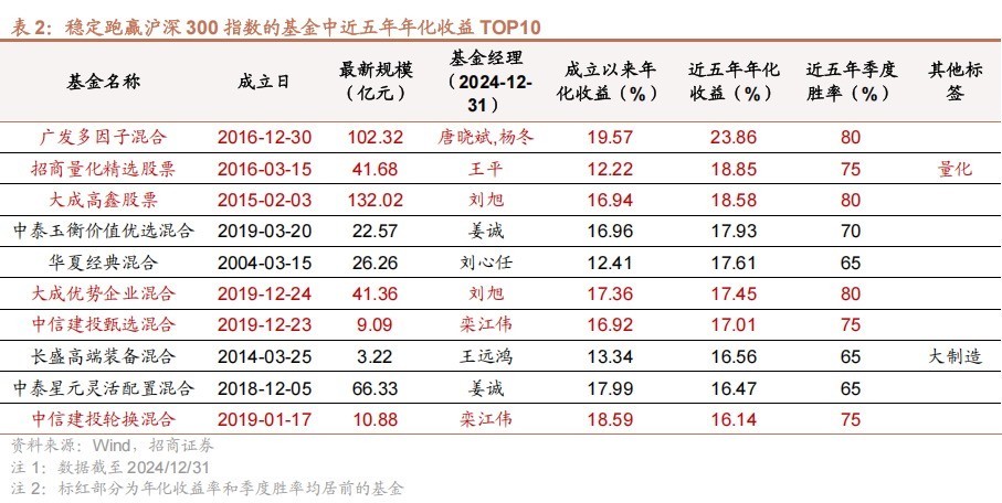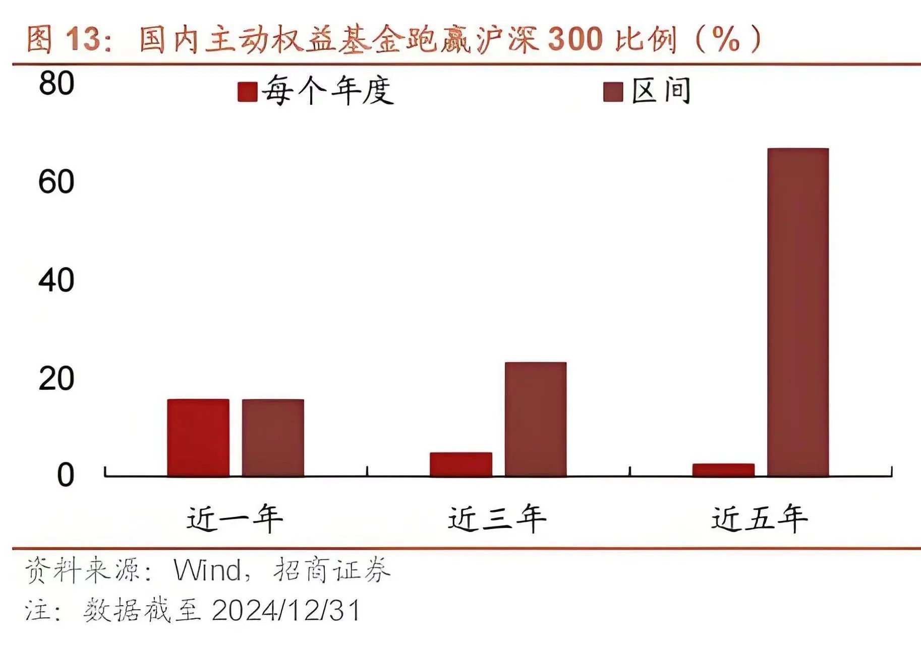 据招商证券统计,截至2024年12月31日,连续五年跑赢沪深300指数的主动权益基金,全市场共有51只,占比仅有2.24%。其中,全市场投资的主动权益基金有32只,量化基金10只,主题型基金9只(集中在制造、科技、新能源和消费)。